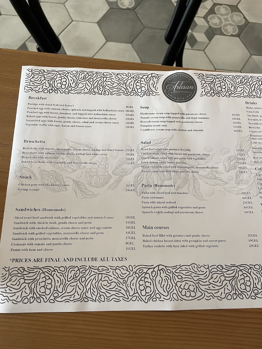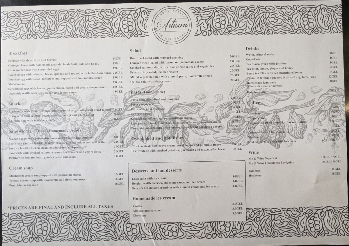 Introducing the menu of Artisan - Tbilisi 0160, a charming café located on Sulkhan Tsintsadze Street, Tbilisi. Here, culinary delights await, from aromatic coffee to exquisite pastries. Customers rave about the lava cake, a standout dessert that perfectly captures the café's dedication to quality. The menu extends beyond sweets, featuring breakfast options like scrambled eggs and hearty dishes such as baked beef with potatoes, shrimp salad, and steak salad.